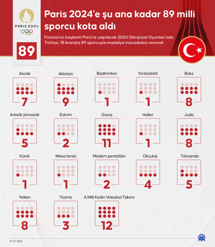 Fransa'nın başkenti Paris'te yapılacak 2024 Olimpiyat Oyunları'nın başlamasına 25 gün kalırken kota alan milli sporcu sayısı 89'a yükseldi.