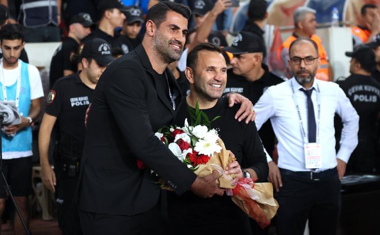 İki teknik direktör Volkan Demirel ile Okan Buruk maç öncesi sıcak görüntüler verdi.