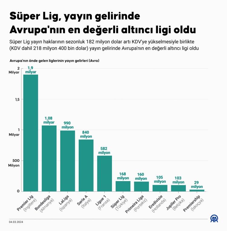 Sezonluk 182 milyon dolar üzerinden yapılan anlaşma 168 milyon euro’ya denk geliyor. Avrupa’nın önde gelen liglerinin yayın gelirleri şu şekilde…