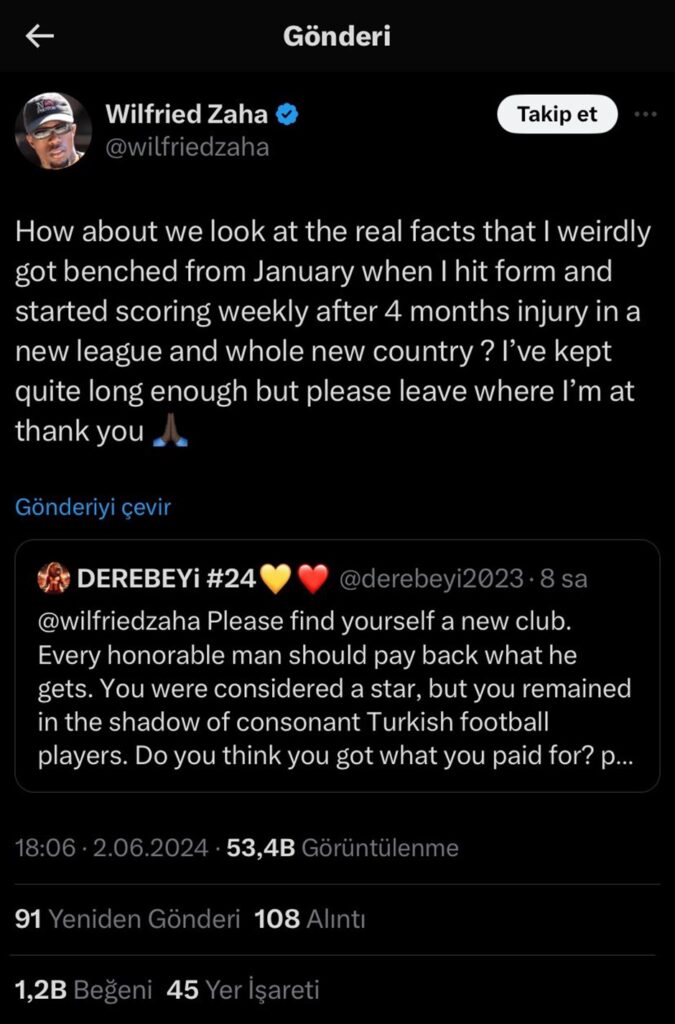 Galatasaraylı olduğu düşünülen bir taraftar, X üzerinden Zaha’yı da etiketleyerek, “Lütfen kendine yeni bir takım bul. Onur sahibi her insan kendisine yapılanın karşılığını ödemelidir. Yıldız bir oyuncu olarak görüldün fakat şöhret sahibi olmayan Türk futbolcuların gölgesinde kaldın. Aldığın paranın karşılığını verdiğini düşünüyor musun, lütfen git” yazdı.