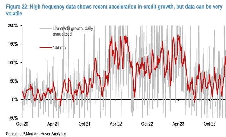 Amerikan yatırım bankası JPMorgan’ın son Türkiye raporunda enflasyonla mücadeleden yan çizilmeye başlandığı konusunda önemli tespitler var. JPMorgan yüksek frekanslı verilerin kredilerde canlanmaya işaret ettiğini belirtiyor.