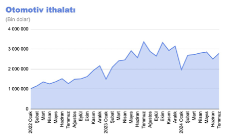 Hemen aşağıdaki tablo kara taşıtları, yani oto ithalatının aylar bazındaki seyrini gösteriyor. Görüldüğü gibi yurtiçi talebi baskılamak için alınan onca önleme, onca faiz artırımına, onca makro ihtiyati tedbire rağmen oto ithalatında ciddi bir düşüş yok.