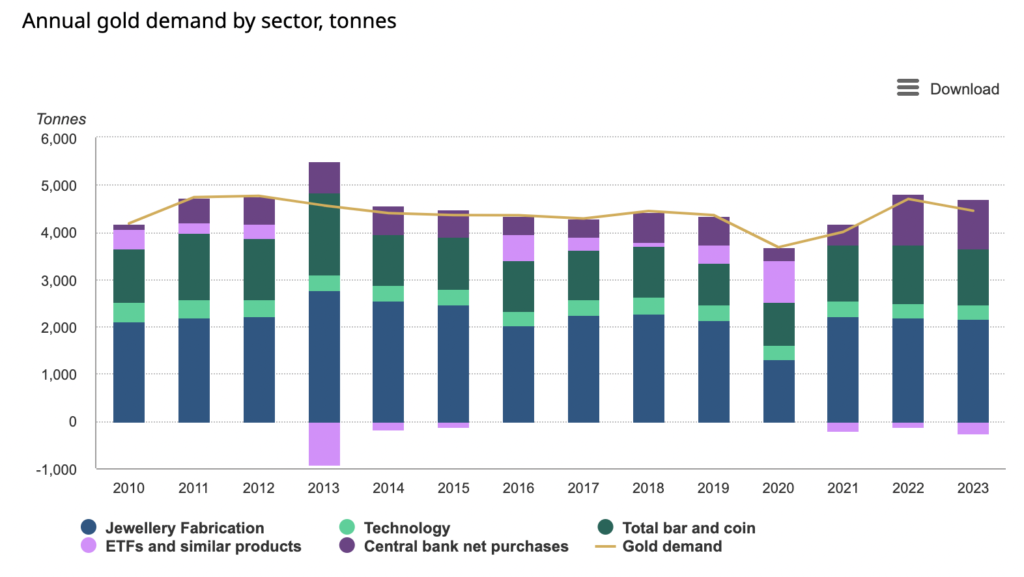(Sırasıyla, mücevherat ve kuyumculuk, teknoloji, madeni para, yatırım fonları, merkez bankalarının alımları)