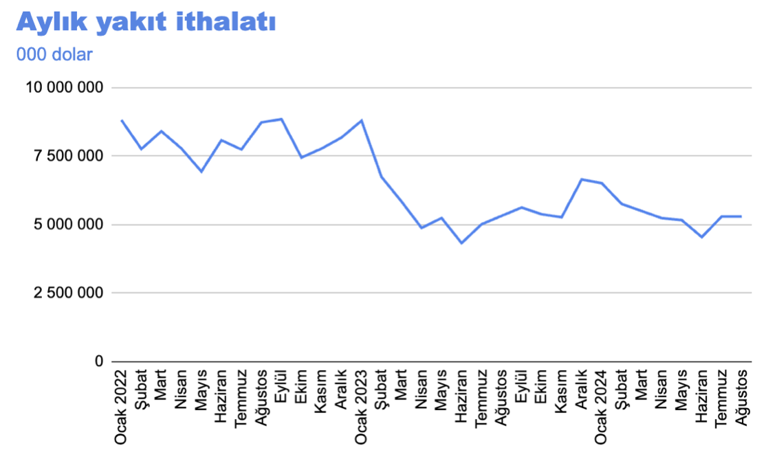 İthalat nasıl kapandı? Enerji ithalatındaki düşüşün payı büyük. Türkiye son bir yılda 66.2 milyar dolarlık enerji ithalatı yaptı (Organik kimyasallar hariç). Bu tutar 2022 Ağustos ayı ve 2023 Eylül ayı arasında 78.4 milyar dolardı. Aşağıdaki tablo Türkiye’nin aylık yakıt ithalatını gösteriyor, 2022 yılında ayda yaklaşık 8 milyar dolarlık enerji ithalatı yapan ülke bugün yine yaklaşık 5 milyar dolarlık ithalat yapıyor. Bunun arkasındaki temel faktör petrol ve doğalgaz fiyatlarının bütün dünyada gerilemesi.