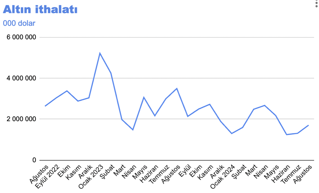 Altın ithalatına getirilen kotanın da dış ticaret açığının (Dolayısıyla cari açığın) kapanmasında büyük payı var. 2021’deki faiz indirimi sonrasında altın ithalatı patlamış, Türkiye ayda 3-4 milyar dolar (Hatta 2023 Ocak ayında 5.2 milyar dolar!) altın ithal etmeye başlamıştı. Altın ithalatına getirilen kota ve bu arada yurtiçinde mevduat faizinin yükselmesi altın ithalatının 1.3 milyar dolara kadar düşmesini sağladı (Ocak ve Temmuz 2024). Geçen Ağustos’ta biraz artarak 1.7 milyar dolar oldu ama 2022 yılındaki çılgın altın ithalatı artık çok geride kaldı. Türkiye’nin altın ithalatı son bir yılda 23.7 milyar dolar oldu. Oysa 2022 Eylül ile 2023 Ağustos arasındaki 12 ayda 37 milyar dolarlık altın ithal edilmişti!