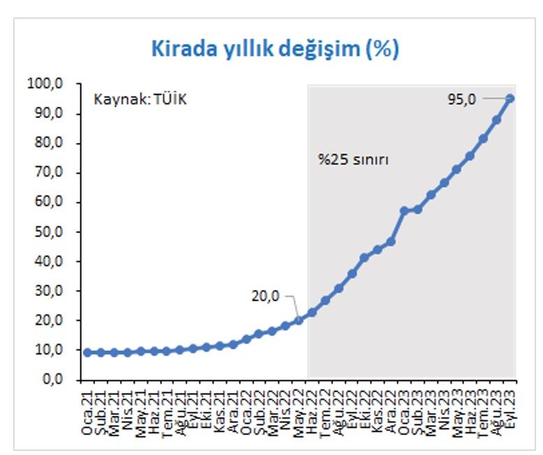Kira artış oranı mesela sıkı para politikasıyla durur mu? Türkiye İstatistik Kurumu’nun (TÜİK) verilerine göre kira artış oranı, devletin yüzde 25 sınırına rağmen Eylül ayında yüzde 95 oldu. İktisatçı Orhan Karaca’nın sosyal medyada paylaştığı grafik şöyle: