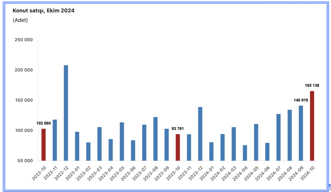 Konut satışlarındaki artış daha sonraki aylarda da sürdü. Ve geçen hafta açıklanan veriye göre ekimde kelimenin tam anlamıyla patladı ve geçen yılın aynı dönemine göre yüzde 76 arttı. Tablo şöyle: