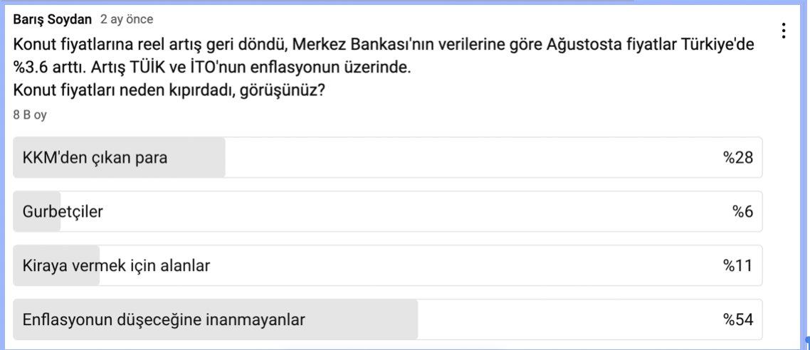 Temmuz ayında konut satışları uzun bir aradan sonra yeniden artışa geçtiğinde YouTube kanalımda bu konuda bir anket açmıştım. Sekiz binden fazla oyun kullanıldığı ankette öne çıkan seçenek “enflasyonun düşeceğine inanmayanlar”dı.