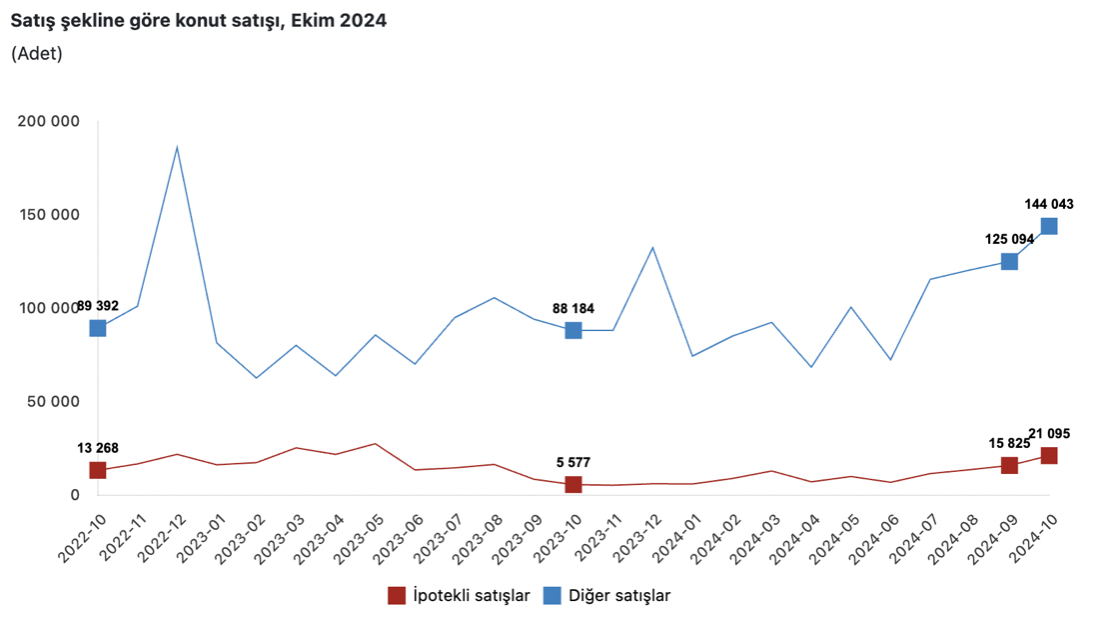 Hayır, bunun nedeni konut kredisi kullanımındaki artış değil. Evet, konut kredisi kullanımında son aylarda bir kıpırdanma var ama kredili satışların toplam satışlar içindeki oranı yüzde 12 ile hala uzun dönem ortalaması olan yüzde 30’ların çok altında (emlakın altın çağı olan 2010’lu yılların başında İstanbul’da kredili satışların oranı yüzde 50’ye ulaşmıştı). Aşağıdaki tabloda görüleceği gibi konut satışları büyük oranda peşin parayla yapılıyor (İpotekli satışlar kredili satışları gösteriyor):
