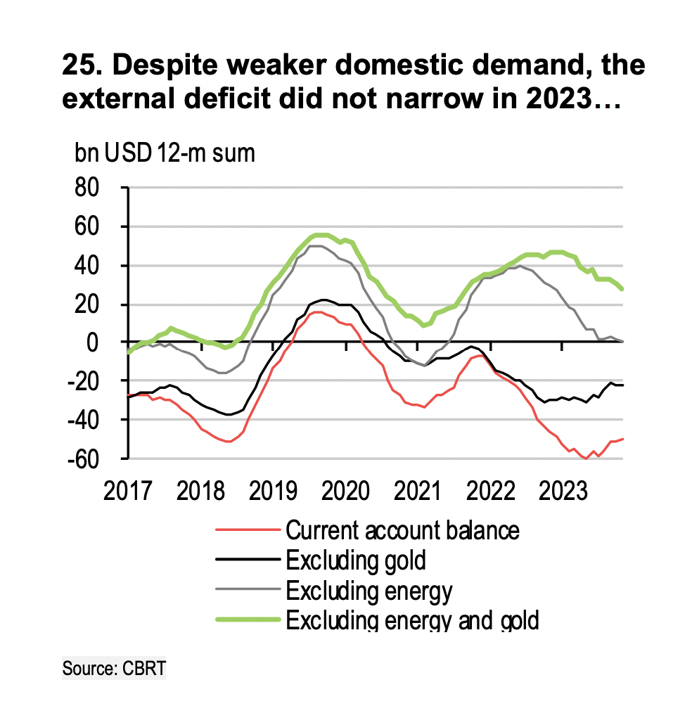 (Milyar dolar, kırmızı cari denge, siyah altın hariç cari denge, gri enerji hariç cari denge, yeşil enerji ve altın hariç cari denge)