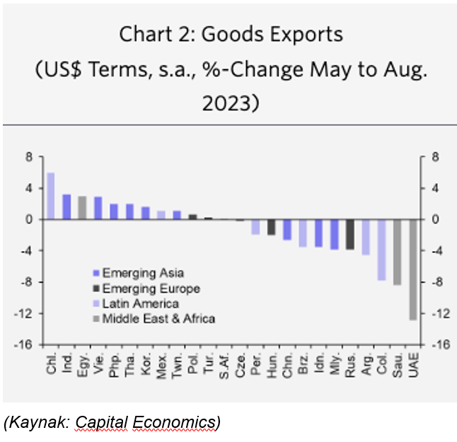Türkiye bu grafikte Tur kısaltmasıyla yer alıyor. Görüldüğü gibi ihracatımız yerinde sayıyor. Aslında bunun için Capital Economics’in şehadetine gerek yok, Türkiye İstatistik Kurumu’nun açıkladığı aylık dış ticaret verileri ihracatın geçen yıldan bu yana ya artmadığını ya da birkaç puanlık artışlar sağlayabildiğini gösteriyor. Türkiye’nin aylık ihracatı 3 yıldır ortalama 20 milyar dolarda çakıldı kaldı.