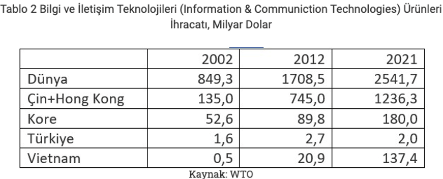 Bu sorunun yanıtı Türkiye’nin yüksek teknoloji ihracatının yıllardır, ne yılları on yıllardır yerinde saymasında, Vietnam’ın ise büyük bir atılım yapmasında saklı. Prof. Ercan Uygur geçenlerde “Türkiye’nin teknolojide ve ihracatta geri düşüşü” başlıklı çok önemli bir yazı yazdı. Uygur’un aktardığı verilere göre 20 yıl önce Türkiye’den daha az bilgi teknolojileri ihracatı yapan Vietnam bugün 70 kat fazla ihracat yapıyor.