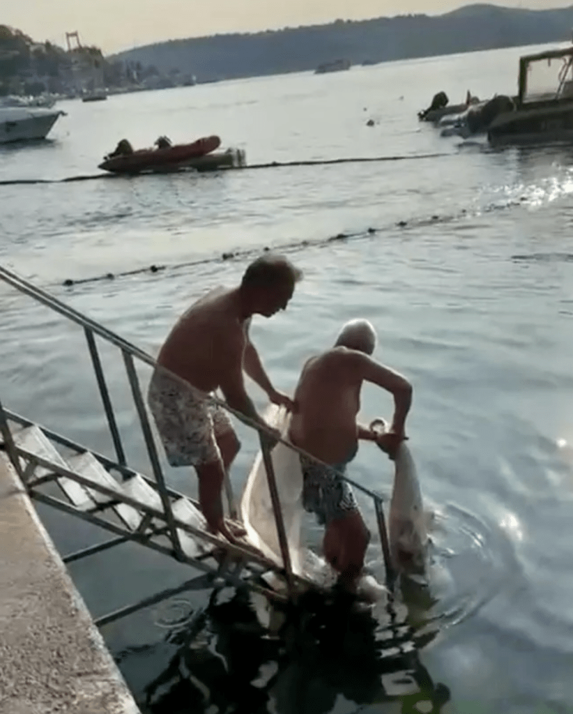 Olayı cep telefonuyla kaydeden ve yunusu çıkaran Azmi Yıldız “Kıyıdan geliyordu, ben ne olduğunu bilemedim. Yakına gelince bir bakayım dedim, baktım ki balık beyaz yunus balığıydı. Ölmüş, çıkartmaya çalıştım. Kardeşimi çağırdım beraber çıkarttık ve attık. Yarım saat sonra da fare geldi, onu da çıkarttık. Sonra çöp konteynerini caddeden buraya getirdim. Poşetleyip içerisine attık. Çok büyüktü. Hiç olmuyordu, ilk defa gördüm. Neden olduğunu bilemiyorum, çok kötü bir şeydi. Çok önce ölmüştü. Kokmuş ve kaburgaları iskeletleri dışarıya çıkmış, hayvan parçalanmıştı” dedi.