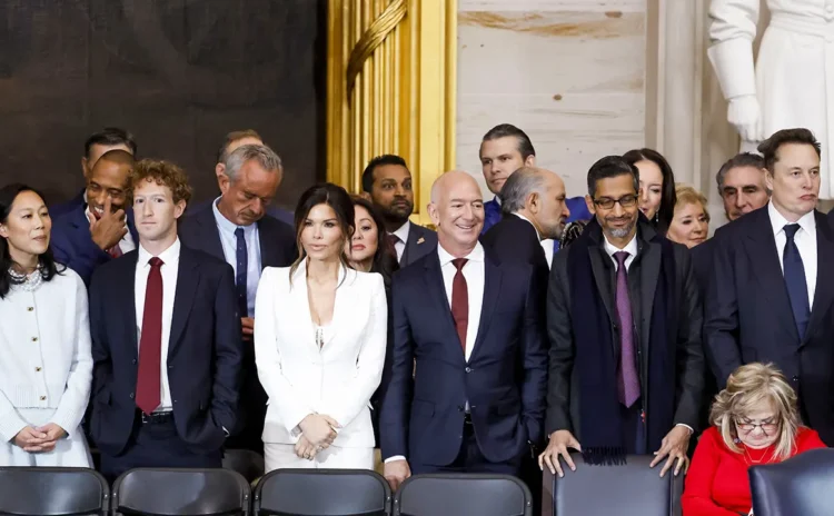İşte Jeff Bezos gülümseyen bir yüzle orada duruyor. Sahibi olduğu Amazon kurulduğundan beri daha az vergi ödemek, devlet desteği almak ve açılan davalardan kurtulmak için 16 milyar dolar lobi harcaması yapmış. Ayrıca uzay şirketi Blue Origin’in tasarladığı uydu ağını hayata geçirmek için devlet desteğine ihtiyaç duymuş. Yıllardır Demokrat Partili olarak biliniyor. Trump’ın ikinci dönemi yaklaşırken yükselen dalgayı fark etmiş ve yön değiştirmiş. Sahibi olduğu Washington Post, Joe Biden’ın yarıştan çekilmesi üzerine normalde Kamala Harris’i destekleyecekken Bezos gazetenin yayın kuruluyla anlaşma yaparak (ABD burası tabii, doğrudan emir verilemiyor gazetecilere) başkan seçimlerinde herhangi bir adayın desteklenmemesini sağlamış.