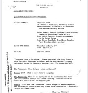 O gün Amerikan Başkanı Gerald Ford Beyaz Saray’ın Oval ofisinde Cumhuriyet Halk Partisi Genel Başkanı ve eski Başbakan Bülent Ecevit’i kabul ediyordu. Amerikan Başkanı Ford’a Dışişleri Bakanı Henry Kissinger ve Ulusal Güvenlik Danışmanı eşlik ediyordu. O tarihte Ecevit Başbakan değildi. Başbakan Süleyman Demirel’di.