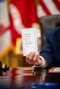 Trump 4 gazeteci ile görüşmeye başladıktan kısa süre sonra Sekretaryasından biri içeri girip kartona yazılmış notu Başkan Trump’a uzattı.