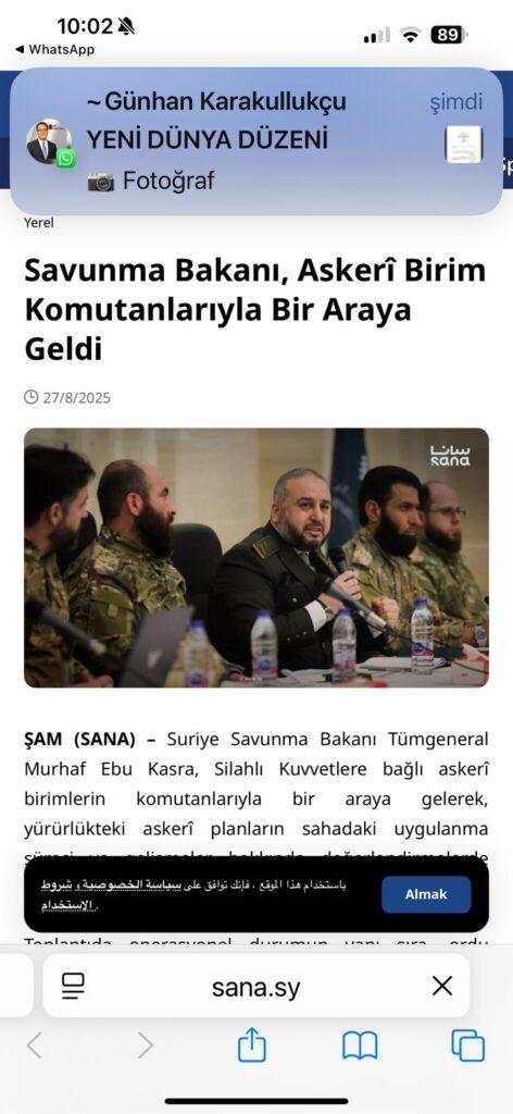 “Suriye Savunma Bakanı Tümgeneral Murhaf Ebu Kasra Silahlı Kuvvetlere bağlı askerî birimlerin komutanlarıyla bir araya gelerek yürürlükteki askerî planların sahadaki uygulanma süreci ve gelişmeler hakkında değerlendirmelerde bulundu.”