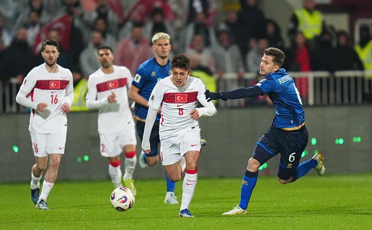 2026 FIFA Dünya Kupası Avrupa Elemeleri play-off turu finalinde Kosova ile Türkiye, Fadil Vokrri Stadı’nda karşılaştı. Bir pozisyonda A Milli Futbol Takımı oyuncusu Arda Güler (8) ile Kosova Milli Takımı oyuncusu Elvis Rexhbecaj (6) mücadele etti. ( Hakan Akgün - Anadolu Ajansı ) Dün akşamki Milli maçtan kafamda kalacak olan sahne 9’uncu dakikada Arda Güler’in attığı pastı.