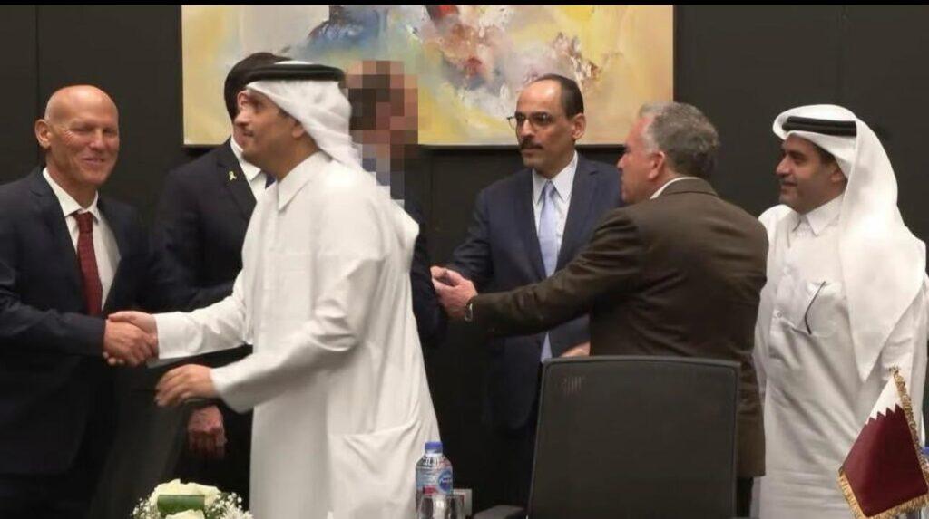 Katar Başbakanı El Sani, İsrail heyetindeki General Nitzan Alon ile el sıkışıyor.