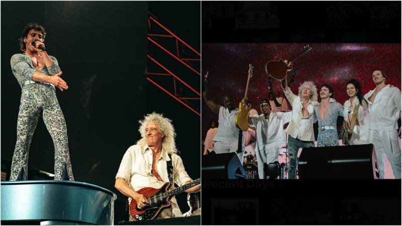 Benson Boone konserin sonunda Bohemian Rhapsody’i söylerken bir ara durdu ve “Bayanlar ve Baylar Brian May” diyerek arkasındaki platformda ışıkların aydınlattığı gitaristi tanıttı.