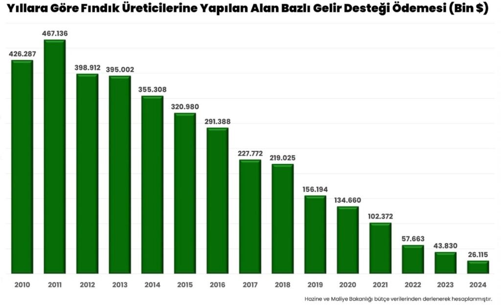 Grafikte de görüldüğü gibi ilk olarak 2010 yılında yapılan 426 milyon dolarlık destek ödemesi 2011 yılında 467 milyon dolara yükselmiş sonraki yıllarda ise sürekli azalmıştır. 2023 yılının desteğinin ödendiği 2024 yılına geldiğimizde destek 26 milyon dolara kadar düşmüştür. Şimdi fındık üreticisi şunu hesabını yapabilir: