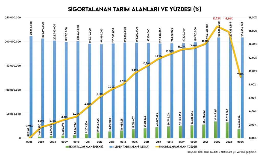 2023 yılında sigortalanan tarım alanının azalması, sadece artan prim ödemeleriyle açıklanamaz. TARSİM yönetiminin bu konudaki başarısızlığı da gözler önünde. Kredi kullanım miktarlarının artmasına ve bankaların sigorta zorunluluğuna rağmen, sigortalanan alan miktarının düşmesi, sistemin işleyişinde ciddi bir sorun olduğunu gösteriyor. Küresel ısınma ve iklim değişikliğinin etkileriyle mücadele eden çiftçilerin sigorta yapmaktan kaçınmalarının sebepleri sorgulanmalı.