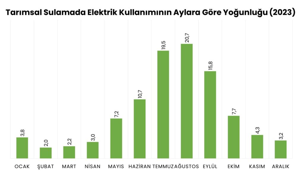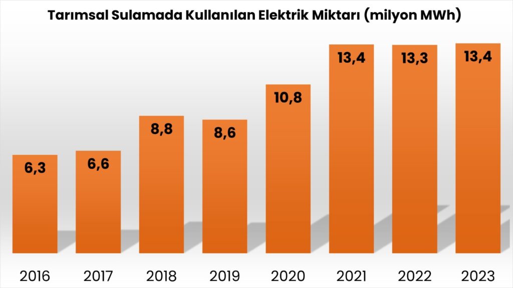 Küresel ısınma ve iklim değişikliğinin etkilerinin giderek arttığı, Tarım ve Orman Bakanlığı’nın suya göre tarım stratejisini benimsediği bir dönemde, sulu tarım yapmak için elektrik kullanımı kaçınılmaz hale geldi. 2016 yılında 6,3 milyon MWh tarımsal elektrik kullanan çiftçilerimiz, 2023 yılında 13,4 milyon MWh elektrik kullandı ve bu miktar son üç yıldır aynı seviyede. 2024 yılında da benzer bir elektrik tüketimi bekleniyor.