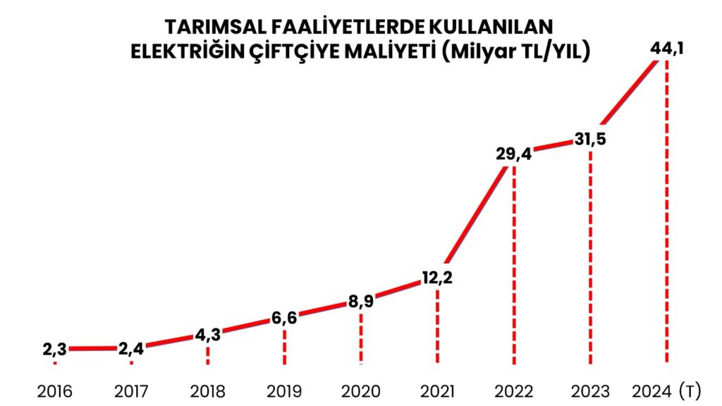 Bu son zam, geçen yılın aynı dönemine göre temmuz, ağustos ve eylül aylarında %56’lık bir artış demektir. Son üç yılda neredeyse aynı oranda elektrik tüketimine 2021 yılında 12,2 milyar lira, 2022 yılında 29,4 milyar lira, 2023 yılında 31,5 milyar lira fatura ödeyen çiftçilerimiz, 2024 yılında tahmini 44,1 milyar lira fatura ödeyecek. Üç yıl önce aynı oranda elektrik kullanımına 12,2 milyar öderken, şimdi tam 3,5 kat artarak 44,1 milyar lira ödeyecekler. %30’luk zammın çiftçiye ek maliyeti ise 12,5 milyar lira olacak.