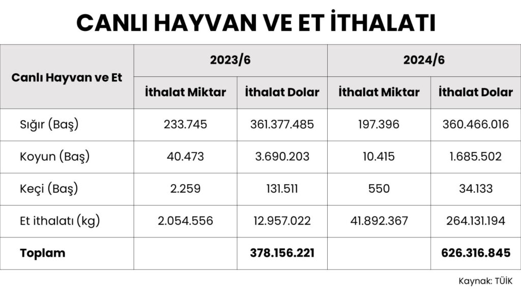Kriz sonrası Tarım ve Orman Bakanlığı hayvancılık krizini durdurmak yerine ithalatı bir çözüm olarak gördü. Geçen yıl 818 bin büyükbaş, 53 bin küçükbaş hayvan ve 34 bin tondan fazla et ithal edilmesine izin verdi. Bu ithalatlara toplamda 1,4 milyar dolar ödeme yapıldı. Ancak bu yıl bakanlık tek yetkili olarak Et ve Süt Kurumu aracılığıyla 600 bin baş canlı hayvan ithal edileceğini duyurdu. 2024 yılının ilk altı ayında 197 bin büyükbaş hayvan ithalatına 11 milyar lira (360 milyon dolar), 11 bin küçükbaş ithalatına 55 milyon lira (1,7 milyon dolar) ve 42 bin ton et ithalatına 8,2 milyar lira (264 milyon dolar) ödeme yapıldı.