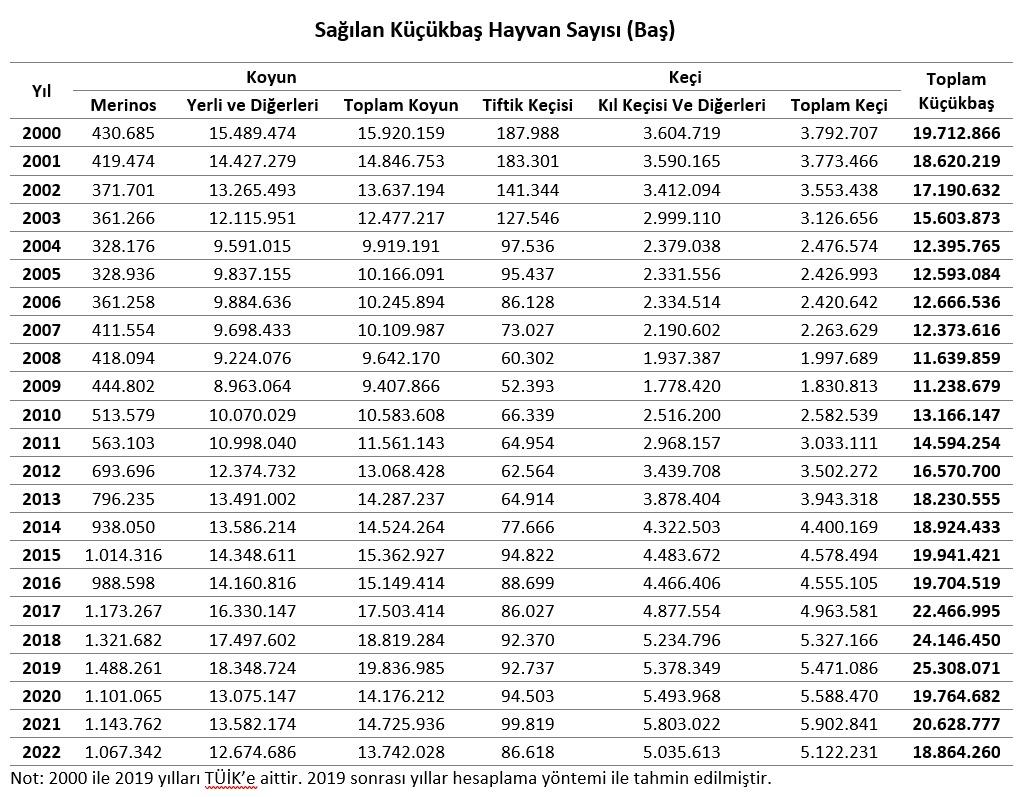 Sağılan küçükbaş hayvan sayısı son 22 senede yüzde 4 azalmasına rağmen süt üretimi yüzde 62 arttı. Ancak tabloda görüleceği üzere sağılan küçükbaş hayvan sayısı 2019 yılında 25,3 milyon iken 2020 yılında 19,8, 2021 yılında 20,6 ve 2022 yılında 18,9 milyon başa düştü. 2019 yılından 2022 yılına sağılan büyükbaş hayvan sayısı 600 bin baş, küçükbaş hayvan sayısı da 6,4 milyon baş azaldı.