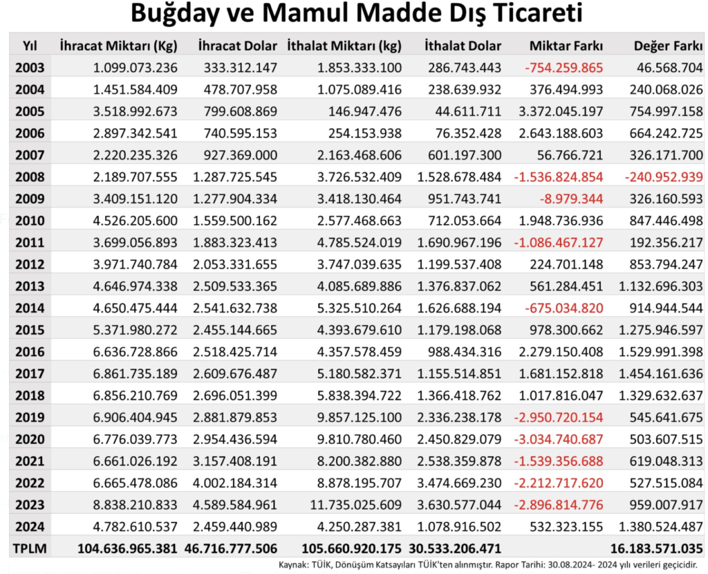 Yukarıdaki tablo buğday alıp bunu un, makarna, irmik, bulgur gibi gıda ürünlerine dönüştürerek sattığımız Buğday Mamul Madde Dış Ticaretini göstermektedir. Özellikle 2019 ile 2023 yılları arasında buğday ithal edip mamul madde olarak satmamıza rağmen içeride buğday kaldığı görülüyor. Ve o yıllarda bu ticaretten önceki yıllara göre çok para kazanmadığımız da ortada. Ancak 2023 yılına gelindiğinde 4,3 milyon ton buğday ithal edilirken içeriden de 532 bin ton buğday işlenip satıldığı gözüküyor. Hatta bu yıl un ve un mamulleri ihracatında şimdiden ülkeye 2023 yılından fazla döviz girmiş görünüyor.