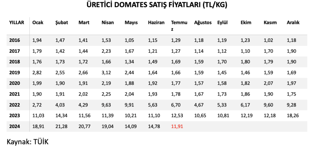 Aylara göre domates fiyatları incelendiğinde, kış aylarında serada yetişen domates fiyatlarının yaz aylarında yerini tarla domatesine bırakmaya başlaması ile fiyatlar düşüş eğilimine giriyor. Özellikle kışın sera domatesi maliyetlerinin yüksek olması nedeniyle fiyatların önceki yıllara göre artması gayet olağan ancak tarla domatesi hasat dönemine yaklaştıkça fiyatlardaki aşırı düşüş bir o kadar endişe verici. Geçen yılın temmuz ayında üretici bir kilo domatesini 12 lira 53 kuruştan satarken bu yıl 11 lira 91 kuruşa satabildi. Zarar ettiği göz göre göre bilinen domates üreticileri için Tarım ve Orman Bakanlığı ile Ticaret Bakanlığı bu durum karşısında gerekli ve yeterli önlemleri zamanında almadığı için sorun halen devam ediyor.