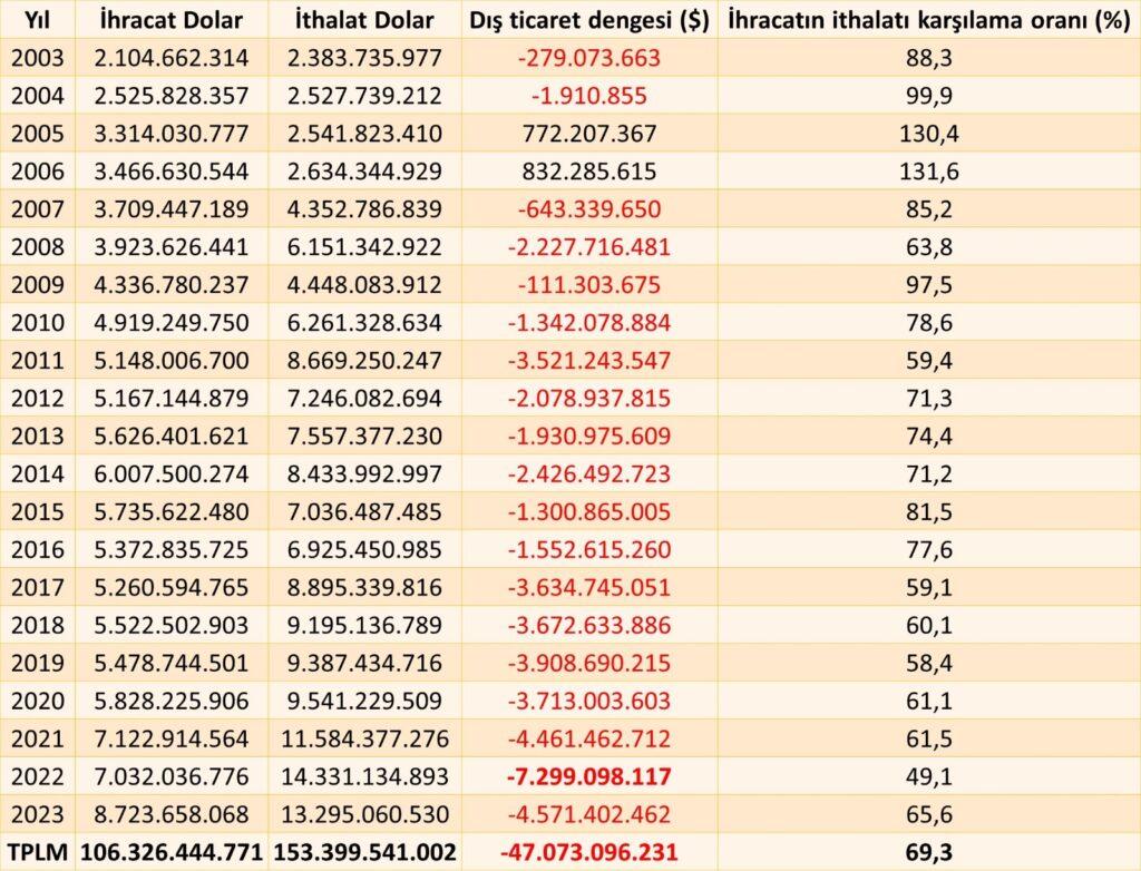 Sadece ithalat yapmakla kalmadık, her yıl ithalatımız arttı, dış ticaret açığımız büyüdü. 2003 ile 2023 yılları arasında 106,3 milyar dolarlık ihracatımıza karşılık 153,4 milyar dolarlık ithalat yapmışız. Son 21 yılda 47,1 milyar dolar açık verdik. Özellikle 2022 yılında 14,3 milyar dolarlık ithalatımıza karşılık 7 milyar dolarlık ihracat yapabildik. O yıl tarımda 7,3 milyar dolarla Cumhuriyet tarihinin en büyük dış ticaret açığıyla karşılaştık.