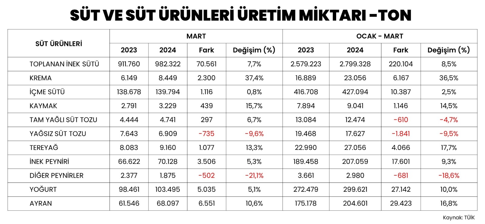 TÜİK’in mart ayı ile ilk çeyrek süt ve süt ürünleri üretimini incelediğimizde, sanayiye aktarılan süt miktarı aylık bazda %7,7, yıllık bazda %8,5 oranında artmış. Demek ki süt üreticileri ya fiyattan memnun ya da memnun olmasa da mecburen vermek zorunda. Çiftçi ise memnun olmasa da işin doğası gereği ürettiği sütü dökemeyeceğine göre sütünü vermek zorunda kalıyor.