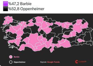 Şehirlerin yüzde 52.7’sinde daha çok Oppenheimer filmi ile ilgili arama yapılmış. Barbie filmi hakkında arama yapanlar yüzde 47.3’te kalmış.