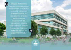 Karar madde 60: ”Hiç kuşkusuz Anayasa’nın 153. maddesinin açık hükmüne rağmen Anayasa Mahkemesi kararları uygulanmayarak hak ve özgürlüklerin etkili bir şekilde korunması yükümlülüğünün yerine getirilmemesi devlet organlarının uymakla yükümlü oldukları Anayasa’nın üstünlüğü ve bağlayıcılığı ilkelerine aykırı durumlara yol açar.”