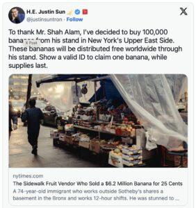 Bu iç yakıcı haber ilginç biçimde o muza 6,2 milyon dolar para veren adamın, Hong Kong’da yaşayan kripto milyoneri Justin Sun’ın da içine dokundu belli ki ve dün herhalde iyi niyetle bir sosyal medya paylaşımı yapıp bir yandan The New York Times’ın haberini alıntıladı, bir yandan da Shah Alam’a teşekkür etmek amacıyla onun manav tezgahından 100 bin muz daha alıp isteyen herkese bedava dağıtacağını söyledi.