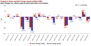 19 Marttan 14 Nisana kadar Merkez Bankası ne gün ne kadar rezerv kaybıda uğradı? Kırmızılar brüt rezerv, maviler net rezerv rakamları. (Kaynak: Turkey Data Monitor)