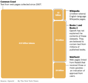 Yapay zeka sohbet robotları, yani geniş dil modelleri dili bizim gibi okuyarak ‘öğreniyor.’ The New York Times aşağıya da koyduğum bir grafiği yayınladı. Grafik yapay zekanın öğrenme ve bilgi kaynaklarını gösteriyor.