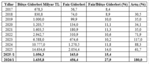Veriler, 2022’den itibaren bütçe giderlerinde belirgin bir ivmelenmeye işaret ediyor. Bu sıçramada, enflasyonla uyumlu olmayan düşük faiz politikasının ardından yaşanan kur ve fiyat artışları etkili oldu. 2023 ve sonrasında ise deprem nedeniyle zorunlu kamu harcamaları devreye girdi.