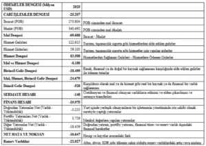 2025 Yılı Ödemeler Dengesi Özet Tablosu (TCMB 2025 yılı Ödemeler Dengesi Tablosu verileri özetlenerek tarafımızdan hazırlanmıştır):