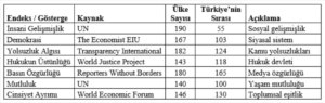 2025 yıl sonu tahminleri ışığında Türkiye’nin başlıca sosyal ve siyasal endekslerdeki sıralaması şöyle: