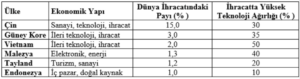 Çin, bu ülkeler arasında ekonomide uzmanlaşmayı en fazla çeşitlendirmiş olanıdır. Çin dışındakilerin dünya ticaretinde ağırlığı düşük görünüyor. Tayland ve Endonezya dışındakiler ağırlıklı olarak yüksek teknolojiye dayalı ürün ihracatı yapıyor. Vietnam’ın, ihracatının yarısının yüksek teknolojili ürünlere dayanması gelecek için bu ülkeyi öne çıkarıyor.