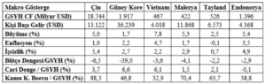 Topluca bir değerlendirme yaparsak üç farklı ekonomik küme ortaya çıkıyor. Çin ve Güney Kore, sistemik ve yapısal olarak küresel ekonomiyi etkileyen büyük ve olgun ekonomilerdir. Vietnam ve Endonezya, yüksek büyüme potansiyeline sahip ancak kişi başı gelir açısından düşük düzeyde kalan yükselen ekonomilerdir. Malezya ve Tayland ise bu iki grup arasında sıkışmış, yapısal dönüşüm sürecinde olan ekonomiler olarak değerlendirilebilir.