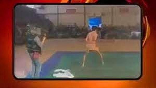 Hideharu gösterisinde ilk başlarda nispeten normal hareketler yapıyordu. Ama bir aşamada aniden soyundu ve çırılçıplak kaldı.
