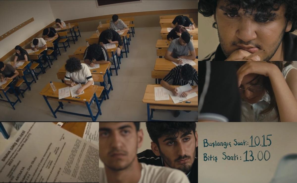 Hemen sonrasında bir derslikte öğrencileri görüyoruz. Kitapçıkları dağıtan açıklamaları yapan gözetmenler, soru çözen cevap kağıdını işaretleren çocuklar, ilerleyen zaman… Deprem bölgesi gençleri üniversite sınavında.