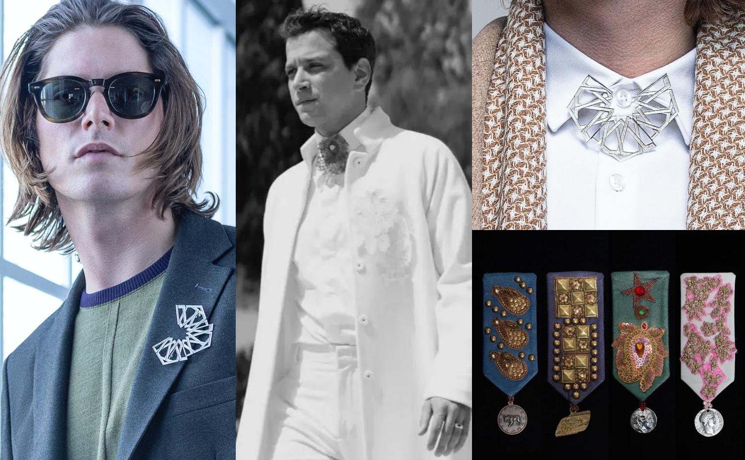 Bu sezon Climber B.C. yeni koleksiyonundaki görünümleri geometrik şekilli broşlarla tamamladı (Üstte solda ve sağda). Broş yakada olduğu gibi papyona benzer şekilde kapalı gömlek yakasında da kullanılabiliyor. Broşu çok yakıştırdığı Selahattin Paşalı’nın tercihi cesur, Zehra Gökçe tasarımı iğne oyası bir broş takmış. Sağ altta Hatice Gökçe’nin madalyayı çağrıştıran broş tasarımları var