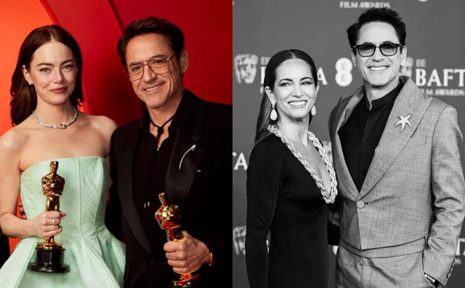 En İyi Yardımcı Erkek oyuncu seçilerek ilk Oscar ödülünü alan Robert Downey Jr., Emma Stone ile (solda). Oyuncu şubat ayındaki BAFTA ödüllerinde Rahaminov Diamonds’ın hazırladığı pırlantalarla kaplı bir deniz yıldızı takıp karısı Susan Downey ile poz vermişti (sağda).